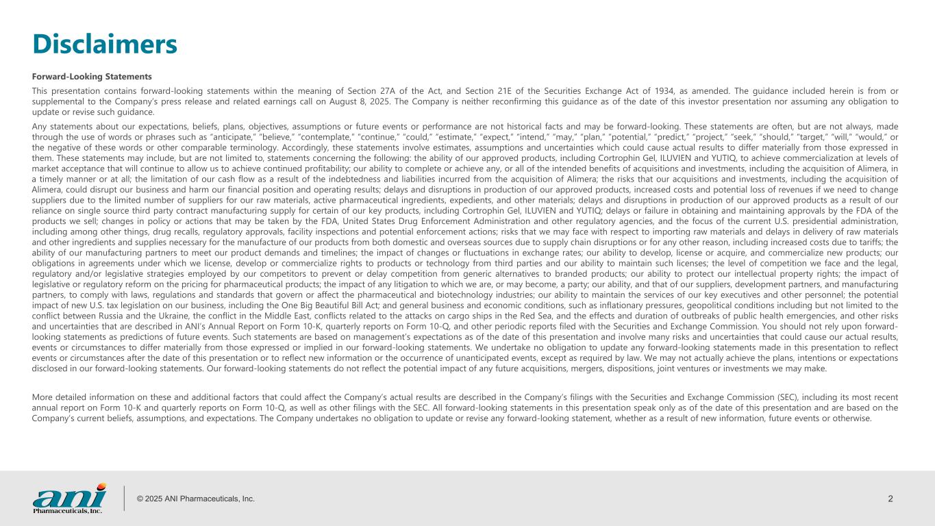 © 2025 ANI Pharmaceuticals, Inc. 2 Disclaimers Forward-Looking Statements This presentation contains forward-looking statements within the meaning of Section 27A of the Act, and Section 21E of the Securities Exchange Act of 1934, as amended. The guidance included herein is from or supplemental to the Company’s press release and related earnings call on August 8, 2025. The Company is neither reconfirming this guidance as of the date of this investor presentation nor assuming any obligation to update or revise such guidance. Any statements about our expectations, beliefs, plans, objectives, assumptions or future events or performance are not historical facts and may be forward-looking. These statements are often, but are not always, made through the use of words or phrases such as “anticipate,” “believe,” “contemplate,” “continue,” “could,” “estimate,” “expect,” “intend,” “may,” “plan,” “potential,” “predict,” “project,” “seek,” “should,” “target,” “will,” “would,” or the negative of these words or other comparable terminology. Accordingly, these statements involve estimates, assumptions and uncertainties which could cause actual results to differ materially from those expressed in them. These statements may include, but are not limited to, statements concerning the following: the ability of our approved products, including Cortrophin Gel, ILUVIEN and YUTIQ, to achieve commercialization at levels of market acceptance that will continue to allow us to achieve continued profitability; our ability to complete or achieve any, or all of the intended benefits of acquisitions and investments, including the acquisition of Alimera, in a timely manner or at all; the limitation of our cash flow as a result of the indebtedness and liabilities incurred from the acquisition of Alimera; the risks that our acquisitions and investments, including the acquisition of Alimera, could disrupt our business and harm our financial position and operating results; delays and disruptions in production of our approved products, increased costs and potential loss of revenues if we need to change suppliers due to the limited number of suppliers for our raw materials, active pharmaceutical ingredients, expedients, and other materials; delays and disruptions in production of our approved products as a result of our reliance on single source third party contract manufacturing supply for certain of our key products, including Cortrophin Gel, ILUVIEN and YUTIQ; delays or failure in obtaining and maintaining approvals by the FDA of the products we sell; changes in policy or actions that may be taken by the FDA, United States Drug Enforcement Administration and other regulatory agencies, and the focus of the current U.S. presidential administration, including among other things, drug recalls, regulatory approvals, facility inspections and potential enforcement actions; risks that we may face with respect to importing raw materials and delays in delivery of raw materials and other ingredients and supplies necessary for the manufacture of our products from both domestic and overseas sources due to supply chain disruptions or for any other reason, including increased costs due to tariffs; the ability of our manufacturing partners to meet our product demands and timelines; the impact of changes or fluctuations in exchange rates; our ability to develop, license or acquire, and commercialize new products; our obligations in agreements under which we license, develop or commercialize rights to products or technology from third parties and our ability to maintain such licenses; the level of competition we face and the legal, regulatory and/or legislative strategies employed by our competitors to prevent or delay competition from generic alternatives to branded products; our ability to protect our intellectual property rights; the impact of legislative or regulatory reform on the pricing for pharmaceutical products; the impact of any litigation to which we are, or may become, a party; our ability, and that of our suppliers, development partners, and manufacturing partners, to comply with laws, regulations and standards that govern or affect the pharmaceutical and biotechnology industries; our ability to maintain the services of our key executives and other personnel; the potential impact of new U.S. tax legislation on our business, including the One Big Beautiful Bill Act; and general business and economic conditions, such as inflationary pressures, geopolitical conditions including but not limited to the conflict between Russia and the Ukraine, the conflict in the Middle East, conflicts related to the attacks on cargo ships in the Red Sea, and the effects and duration of outbreaks of public health emergencies, and other risks and uncertainties that are described in ANI’s Annual Report on Form 10-K, quarterly reports on Form 10-Q, and other periodic reports filed with the Securities and Exchange Commission. You should not rely upon forward- looking statements as predictions of future events. Such statements are based on management’s expectations as of the date of this presentation and involve many risks and uncertainties that could cause our actual results, events or circumstances to differ materially from those expressed or implied in our forward-looking statements. We undertake no obligation to update any forward-looking statements made in this presentation to reflect events or circumstances after the date of this presentation or to reflect new information or the occurrence of unanticipated events, except as required by law. We may not actually achieve the plans, intentions or expectations disclosed in our forward-looking statements. Our forward-looking statements do not reflect the potential impact of any future acquisitions, mergers, dispositions, joint ventures or investments we may make. More detailed information on these and additional factors that co