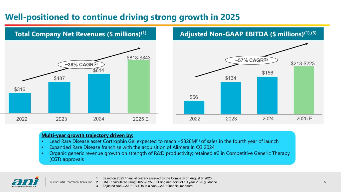 © 2025 ANI Pharmaceuticals, Inc. 4 ANI Pharmaceuticals: Rare Disease and Generics drive robust, profitable growth as we fulfill our purpose of Serving Patients, Improving Lives Key Growth Drivers Rare Disease business with two growing and durable commercial assets: Purified Cortrophin Gel and ILUVIEN(1). Portfolio expansion through M&A and in-licensing. Financial Strength $213-223M 2025 Adjusted Non-GAAP EBITDA(2)(3) $218M Cash(4) 2.2x Net Leverage(5) $818-843M 2025 Estimated net revenue(2) 33-37% Year-over-year net revenue growth(2) 1. ANI received FDA approval to add the NIU-PS indication to ILUVIEN in the U.S. and transitioned commercialization efforts for ILUVIEN and YUTIQ to one brand, ILUVIEN, in the U.S. in June 2025. 2. Based on 2025 financial guidance issued by the Company on August 8, 2025. 3. Adjusted Non-GAAP EBITDA is a Non-GAAP financial measure. 4. As of June 30, 2025 5. Based upon trailing twelve-month non-GAAP EBITDA as of June 30, 2025 Brands with unique commercial capability, high margins and strong cash flow generation Generics with superior R&D capabilities driving new product launches; operational excellence