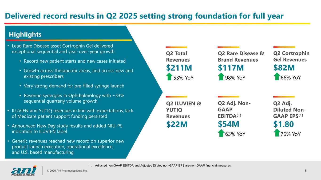 © 2025 ANI Pharmaceuticals, Inc. 5 Well-positioned to continue driving strong growth in 2025 Adjusted Non-GAAP EBITDA ($ millions)(1),(3) 1. Based on 2025 financial guidance issued by the Company on August 8, 2025. 2. CAGR calculated using 2022-2025E utilizing mid-point of full year 2025 guidance. 3. Adjusted Non-GAAP EBITDA is a Non-GAAP financial measure. Multi-year growth trajectory driven by: • Lead Rare Disease asset Cortrophin Gel expected to reach ~$326M(1) of sales in the fourth year of launch • Expanded Rare Disease franchise with the acquisition of Alimera in Q3 2024 • Organic generic revenue growth on strength of R&D productivity; retained #2 in Competitive Generic Therapy (CGT) approvals Total Company Net Revenues ($ millions)(1) $316 $487 2022 2023 2025 E $818-$843 ~38% CAGR(2) $56 $134 $156 2022 2023 2024 2025 E $213-$223~57% CAGR(2) 2024 $614