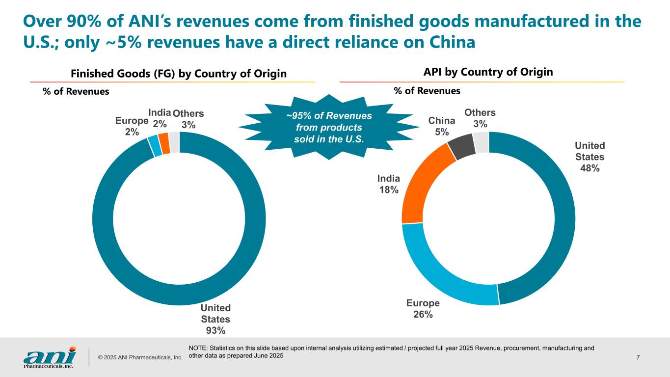 © 2025 ANI Pharmaceuticals, Inc. 6 Q2 Adj. Non- GAAP EBITDA(1) $54M 63% YoY Delivered record results in Q2 2025 setting strong foundation for full year Q2 Total Revenues $211M 53% YoY Q2 Cortrophin Gel Revenues $82M 66% YoY Q2 Rare Disease & Brand Revenues $117M 98% YoY 1. Adjusted non-GAAP EBITDA and Adjusted Diluted non-GAAP EPS are non-GAAP financial measures. Highlights • Lead Rare Disease asset Cortrophin Gel delivered exceptional sequential and year-over-year growth • Record new patient starts and new cases initiated • Growth across therapeutic areas, and across new and existing prescribers • Very strong demand for pre-filled syringe launch • Revenue synergies in Ophthalmology with ~33% sequential quarterly volume growth • ILUVIEN and YUTIQ revenues in line with expectations; lack of Medicare patient support funding persisted • Announced New Day study results and added NIU-PS indication to ILUVIEN label • Generic revenues reached new record on superior new product launch execution, operational excellence, and U.S. based manufacturing Q2 ILUVIEN & YUTIQ Revenues $22M Q2 Adj. Diluted Non- GAAP EPS(1) $1.80 76% YoY