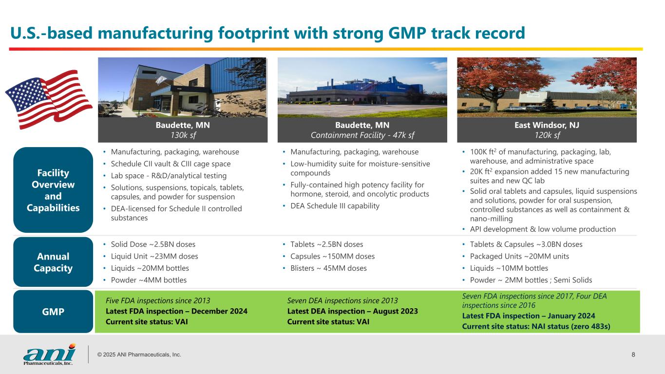 © 2025 ANI Pharmaceuticals, Inc. 7 Over 90% of ANI’s revenues come from finished goods manufactured in the U.S.; only ~5% revenues have a direct reliance on China United States 93% Europe 2% India 2% Others 3% Growth vs Prev. Year - 25%United States 48% Europe 26% India 18% China 5% Others 3% ~95% of Revenues from products sold in the U.S. Finished Goods (FG) by Country of Origin API by Country of Origin % of Revenues % of Revenues NOTE: Statistics on this slide based upon internal analysis utilizing estimated / projected full year 2025 Revenue, procurement, manufacturing and other data as prepared June 2025
