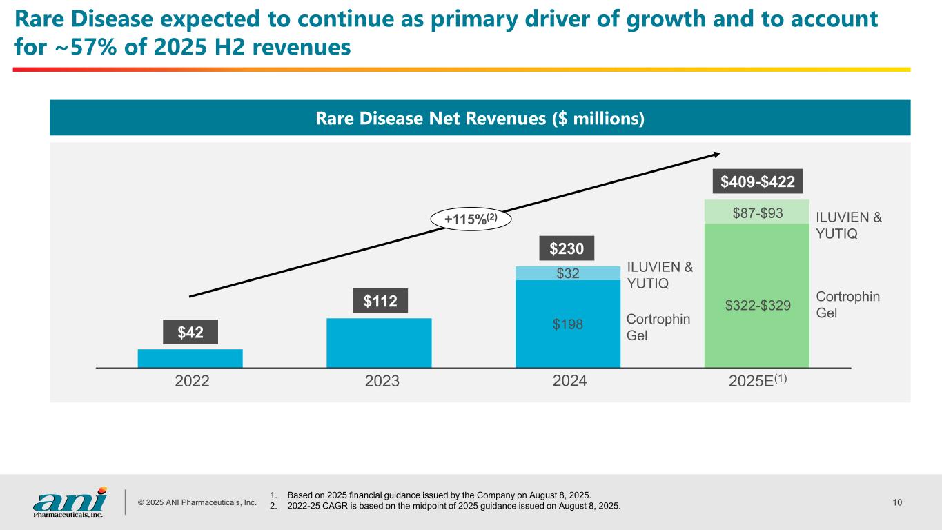 © 2025 ANI Pharmaceuticals, Inc. 9 Full year 2025 guidance 1. Adjusted Non-GAAP EBITDA and Adjusted Non-GAAP Diluted EPS are Non-GAAP financial measures. 2. Not meaningful percentage due to comparison of only a partial year of ILUVIEN and YUTIQ Net Revenue in 2024. 3. Based on 2025 financial guidance issued by the Company on August 8, 2025. Metric ($ millions, except EPS) Full Year 2025 Guidance(3) Previous 2025 Guidance 2024 Actual Year-over-Year Growth Net Revenue (Total Company) $818 - $843 $768 - $793 $614 33 - 37% Cortrophin Gel Net Revenue $322 - $329 $265 - $274 $198 63 - 66% ILUVIEN and YUTIQ Net Revenue $87 - $93 $97 - $103 $32 N/M(2) Adjusted Non-GAAP EBITDA(1) $213 - $223 $195 - $205 $156 37 - 43% Adjusted Non-GAAP Diluted EPS(1) $6.98 - $7.35 $6.27 - $6.62 $5.20 34 - 41%
