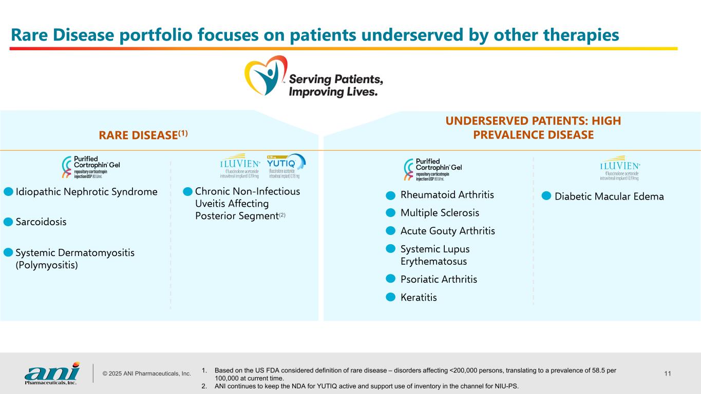 © 2025 ANI Pharmaceuticals, Inc. 10 Rare Disease expected to continue as primary driver of growth and to account for ~57% of 2025 H2 revenues Rare Disease Net Revenues ($ millions) $198 $32 1. Based on 2025 financial guidance issued by the Company on August 8, 2025. 2. 2022-25 CAGR is based on the midpoint of 2025 guidance issued on August 8, 2025. $322-$329 +115%(2) ILUVIEN & YUTIQ Cortrophin Gel 2022 2023 2024 2025E(1) ILUVIEN & YUTIQ Cortrophin Gel $230 $409-$422 $42 $112 $87-$93