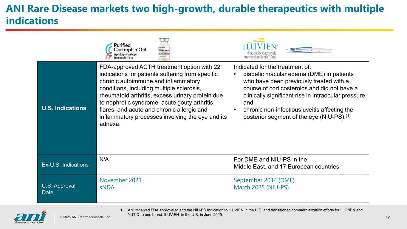 © 2025 ANI Pharmaceuticals, Inc. 11 Rare Disease portfolio focuses on patients underserved by other therapies RARE DISEASE(1) UNDERSERVED PATIENTS: HIGH PREVALENCE DISEASE Idiopathic Nephrotic Syndrome Sarcoidosis Systemic Dermatomyositis (Polymyositis) Rheumatoid Arthritis Multiple Sclerosis Acute Gouty Arthritis Systemic Lupus Erythematosus Psoriatic Arthritis Keratitis Chronic Non-Infectious Uveitis Affecting Posterior Segment(2) Diabetic Macular Edema 1. Based on the US FDA considered definition of rare disease – disorders affecting <200,000 persons, translating to a prevalence of 58.5 per 100,000 at current time. 2. ANI continues to keep the NDA for YUTIQ active and support use of inventory in the channel for NIU-PS.