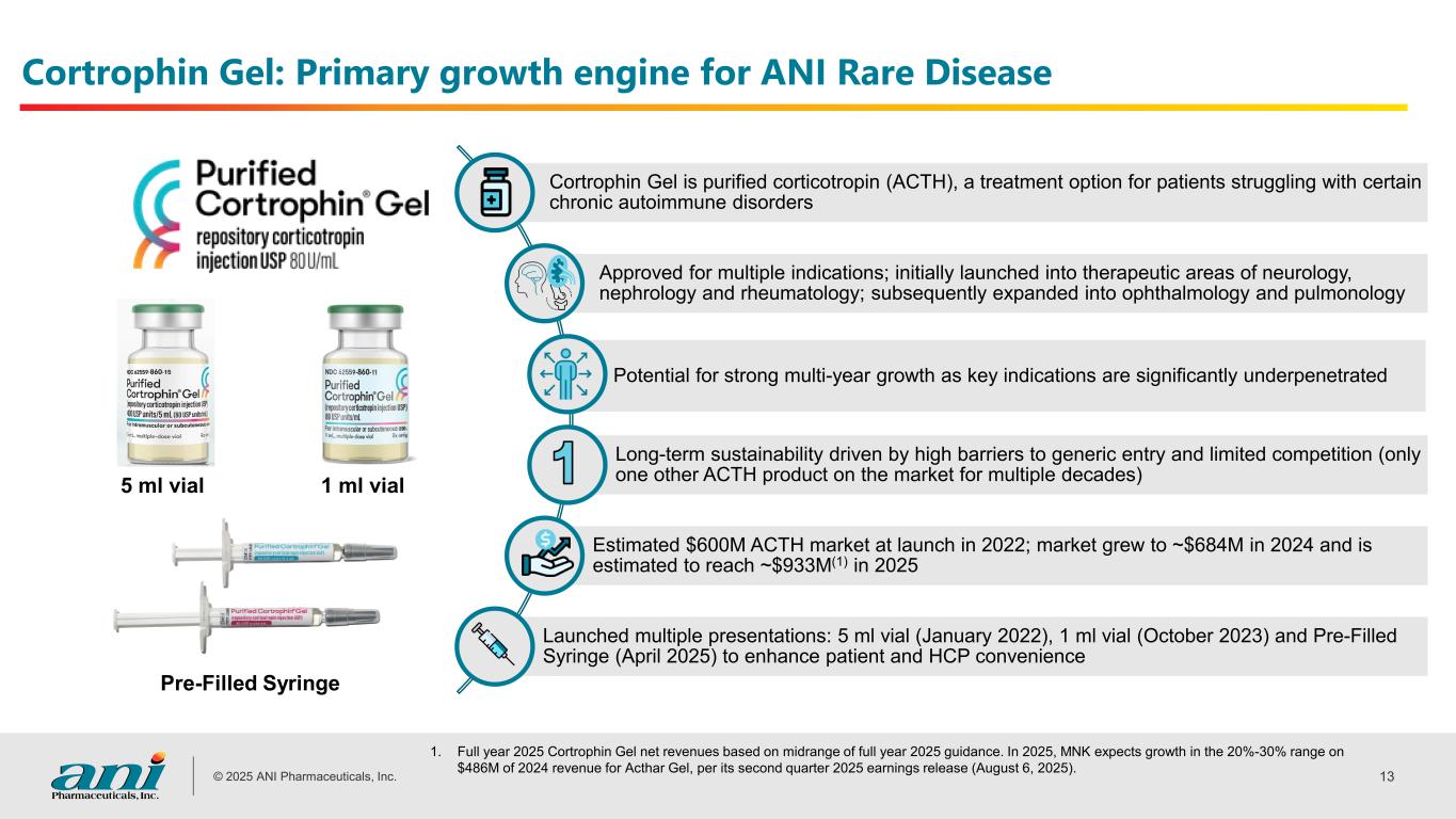 © 2025 ANI Pharmaceuticals, Inc. 12 ANI Rare Disease markets two high-growth, durable therapeutics with multiple indications U.S. Indications FDA-approved ACTH treatment option with 22 indications for patients suffering from specific chronic autoimmune and inflammatory conditions, including multiple sclerosis, rheumatoid arthritis, excess urinary protein due to nephrotic syndrome, acute gouty arthritis flares, and acute and chronic allergic and inflammatory processes involving the eye and its adnexa. Indicated for the treatment of: • diabetic macular edema (DME) in patients who have been previously treated with a course of corticosteroids and did not have a clinically significant rise in intraocular pressure and • chronic non-infectious uveitis affecting the posterior segment of the eye (NIU-PS).(1) Ex-U.S. Indications N/A For DME and NIU-PS in the Middle East, and 17 European countries U.S. Approval Date November 2021 sNDA September 2014 (DME) March 2025 (NIU-PS) 1. ANI received FDA approval to add the NIU-PS indication to ILUVIEN in the U.S. and transitioned commercialization efforts for ILUVIEN and YUTIQ to one brand, ILUVIEN, in the U.S. in June 2025.