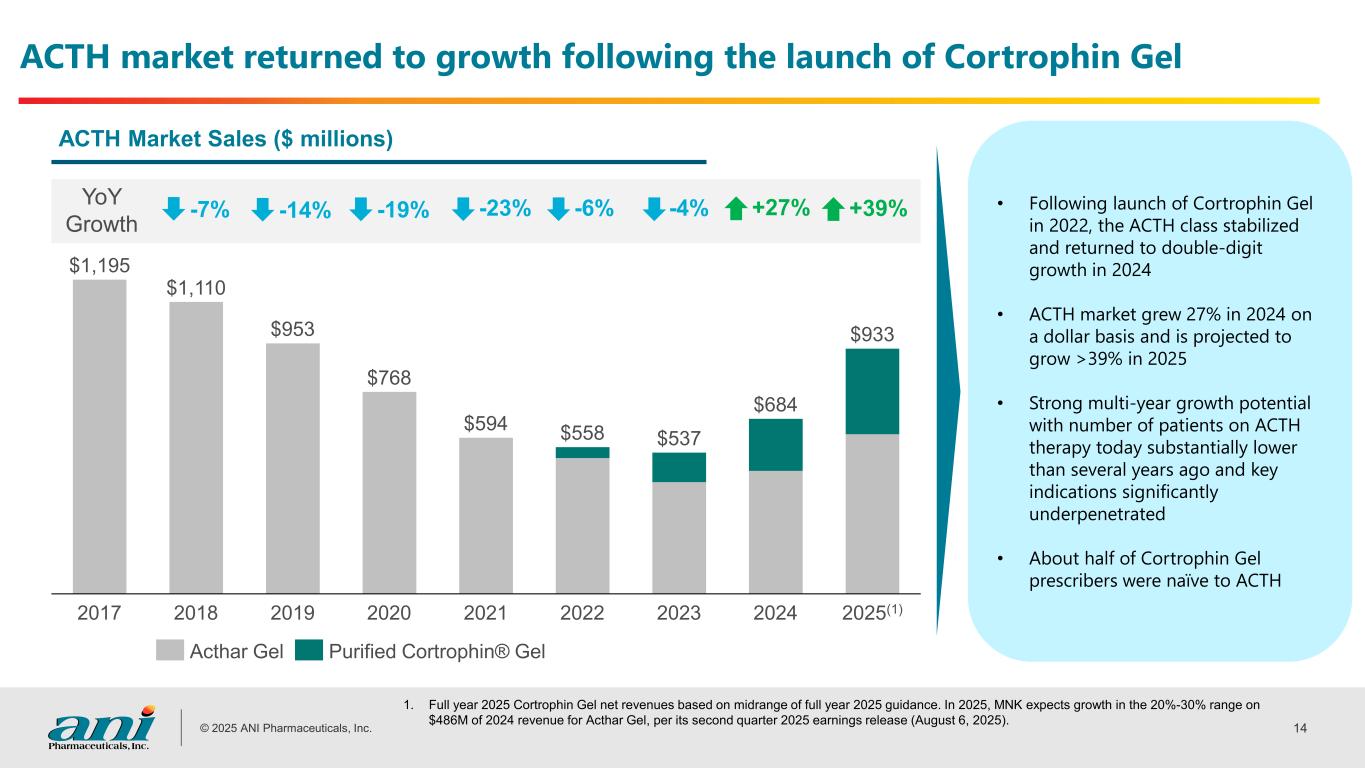 © 2025 ANI Pharmaceuticals, Inc. 13 Cortrophin Gel: Primary growth engine for ANI Rare Disease 5 ml vial 1 ml vial Pre-Filled Syringe Cortrophin Gel is purified corticotropin (ACTH), a treatment option for patients struggling with certain chronic autoimmune disorders Approved for multiple indications; initially launched into therapeutic areas of neurology, nephrology and rheumatology; subsequently expanded into ophthalmology and pulmonology Potential for strong multi-year growth as key indications are significantly underpenetrated Long-term sustainability driven by high barriers to generic entry and limited competition (only one other ACTH product on the market for multiple decades) Estimated $600M ACTH market at launch in 2022; market grew to ~$684M in 2024 and is estimated to reach ~$933M(1) in 2025 Launched multiple presentations: 5 ml vial (January 2022), 1 ml vial (October 2023) and Pre-Filled Syringe (April 2025) to enhance patient and HCP convenience 1. Full year 2025 Cortrophin Gel net revenues based on midrange of full year 2025 guidance. In 2025, MNK expects growth in the 20%-30% range on $486M of 2024 revenue for Acthar Gel, per its second quarter 2025 earnings release (August 6, 2025).