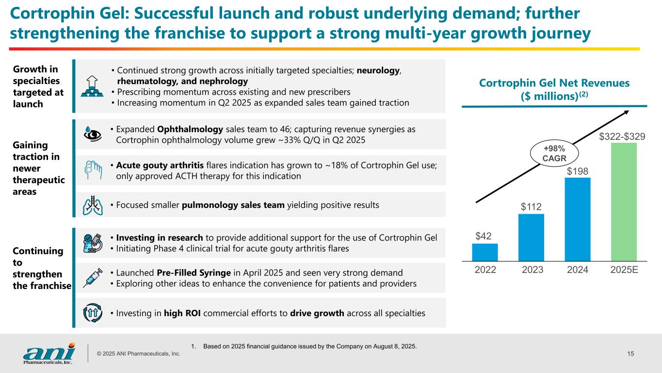 © 2025 ANI Pharmaceuticals, Inc. 14 • Following launch of Cortrophin Gel in 2022, the ACTH class stabilized and returned to double-digit growth in 2024 • ACTH market grew 27% in 2024 on a dollar basis and is projected to grow >39% in 2025 • Strong multi-year growth potential with number of patients on ACTH therapy today substantially lower than several years ago and key indications significantly underpenetrated • About half of Cortrophin Gel prescribers were naïve to ACTH ACTH market returned to growth following the launch of Cortrophin Gel 2017 2018 2019 2020 2021 2022 2023 2024 2025(1) $1,195 $1,110 $953 $768 $594 $558 $537 $684 $933 Acthar Gel Purified Cortrophin® Gel ACTH Market Sales ($ millions) 1. Full year 2025 Cortrophin Gel net revenues based on midrange of full year 2025 guidance. In 2025, MNK expects growth in the 20%-30% range on $486M of 2024 revenue for Acthar Gel, per its second quarter 2025 earnings release (August 6, 2025). -19% -23% -6% -4% +27%YoY Growth -14%-7% +39%
