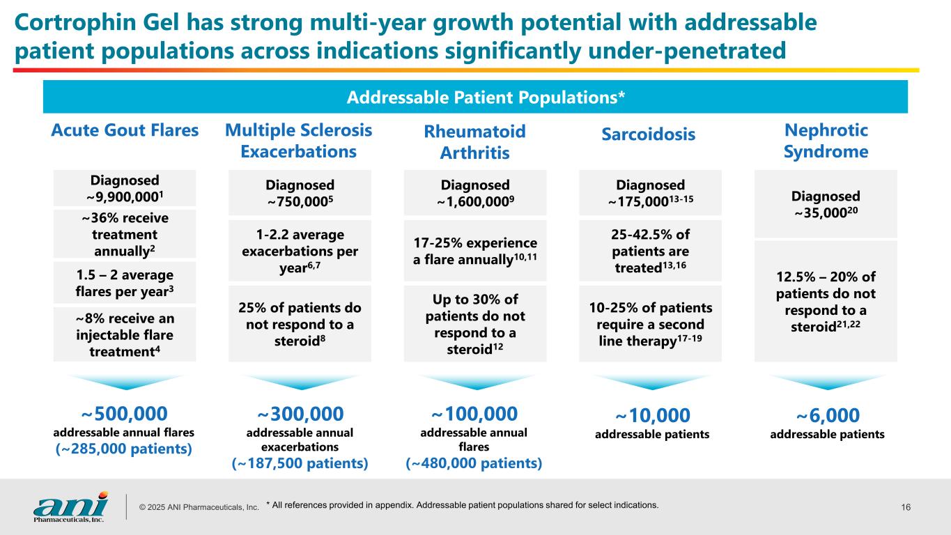 © 2025 ANI Pharmaceuticals, Inc. 15 Growth in specialties targeted at launch Cortrophin Gel: Successful launch and robust underlying demand; further strengthening the franchise to support a strong multi-year growth journey Gaining traction in newer therapeutic areas Continuing to strengthen the franchise Cortrophin Gel Net Revenues ($ millions)(2) 1. Based on 2025 financial guidance issued by the Company on August 8, 2025. • Continued strong growth across initially targeted specialties; neurology, rheumatology, and nephrology • Prescribing momentum across existing and new prescribers • Increasing momentum in Q2 2025 as expanded sales team gained traction • Focused smaller pulmonology sales team yielding positive results • Expanded Ophthalmology sales team to 46; capturing revenue synergies as Cortrophin ophthalmology volume grew ~33% Q/Q in Q2 2025 • Acute gouty arthritis flares indication has grown to ~18% of Cortrophin Gel use; only approved ACTH therapy for this indication $42 $112 $198 2022 2023 2025E +98% CAGR • Investing in high ROI commercial efforts to drive growth across all specialties • Investing in research to provide additional support for the use of Cortrophin Gel • Initiating Phase 4 clinical trial for acute gouty arthritis flares • Launched Pre-Filled Syringe in April 2025 and seen very strong demand • Exploring other ideas to enhance the convenience for patients and providers $322-$329 2024
