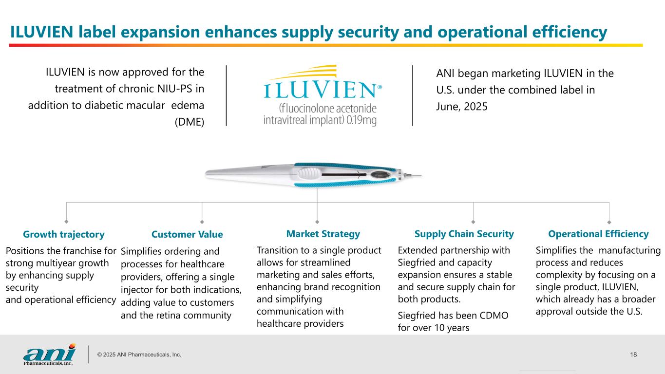 © 2025 ANI Pharmaceuticals, Inc. 17 ILUVIEN and YUTIQ are durable (~36 months) ocular therapies • Provide 36-months of continuous therapy via CONTINUOUS MICRODOSING of fluocinolone acetonide (FAc) in patients with retinal disease • Designed to deliver daily sub-microgram levels of FAc for up to three years from a single injection • FAc is a corticosteroid for inflammation in the retina • Strong global clinical evidence demonstrated in: o Diabetic Macular Edema (DME): Chronic disease that is the leading cause of vision loss in diabetic patients; ~4% of diabetic patients develop clinically significant macular edema o Chronic non-infectious uveitis affecting the posterior segment (NIU-PS) is inflammation of the eye that can lead to pain, visual impairment, and vision loss