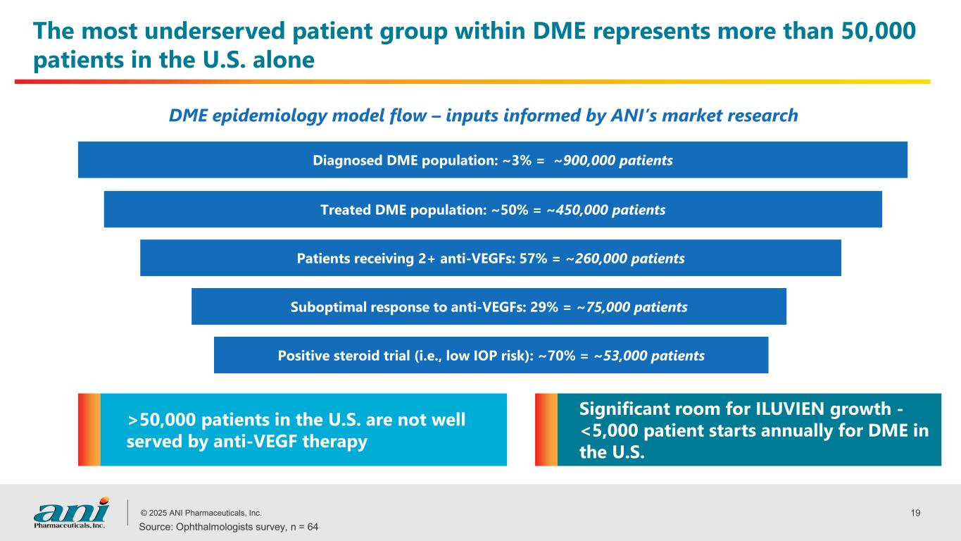 © 2025 ANI Pharmaceuticals, Inc. 18 ILUVIEN label expansion enhances supply security and operational efficiency ANI began marketing ILUVIEN in the U.S. under the combined label in June, 2025 ILUVIEN is now approved for the treatment of chronic NIU-PS in addition to diabetic macular edema (DME) Operational Efficiency Simplifies the manufacturing process and reduces complexity by focusing on a single product, ILUVIEN, which already has a broader approval outside the U.S. Supply Chain Security Extended partnership with Siegfried and capacity expansion ensures a stable and secure supply chain for both products. Siegfried has been CDMO for over 10 years Market Strategy Transition to a single product allows for streamlined marketing and sales efforts, enhancing brand recognition and simplifying communication with healthcare providers Customer Value Simplifies ordering and processes for healthcare providers, offering a single injector for both indications, adding value to customers and the retina community Growth trajectory Positions the franchise for strong multiyear growth by enhancing supply security and operational efficiency