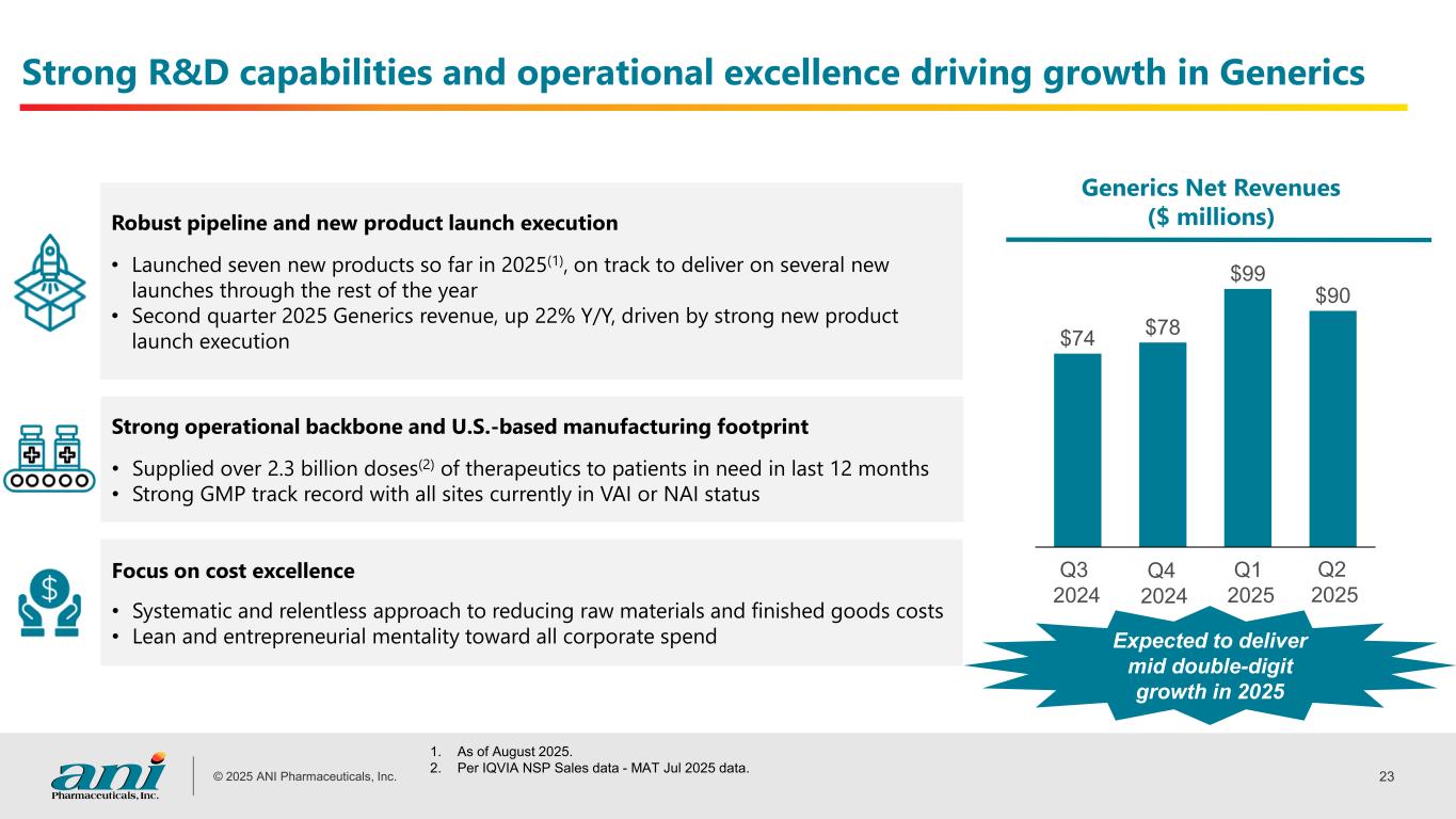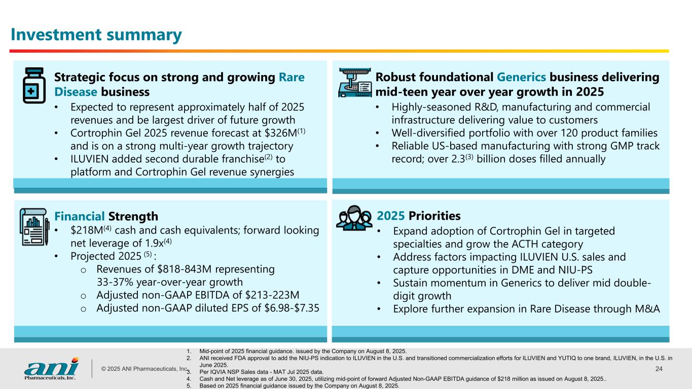 © 2025 ANI Pharmaceuticals, Inc. 23 $74 $78 $99 $90 Strong R&D capabilities and operational excellence driving growth in Generics Robust pipeline and new product launch execution • Launched seven new products so far in 2025(1), on track to deliver on several new launches through the rest of the year • Second quarter 2025 Generics revenue, up 22% Y/Y, driven by strong new product launch execution Focus on cost excellence • Systematic and relentless approach to reducing raw materials and finished goods costs • Lean and entrepreneurial mentality toward all corporate spend Generics Net Revenues ($ millions) Strong operational backbone and U.S.-based manufacturing footprint • Supplied over 2.3 billion doses(2) of therapeutics to patients in need in last 12 months • Strong GMP track record with all sites currently in VAI or NAI status Expected to deliver mid double-digit growth in 2025 Q3 2024 Q4 2024 Q1 2025 Q2 2025 1. As of August 2025. 2. Per IQVIA NSP Sales data - MAT Jul 2025 data.