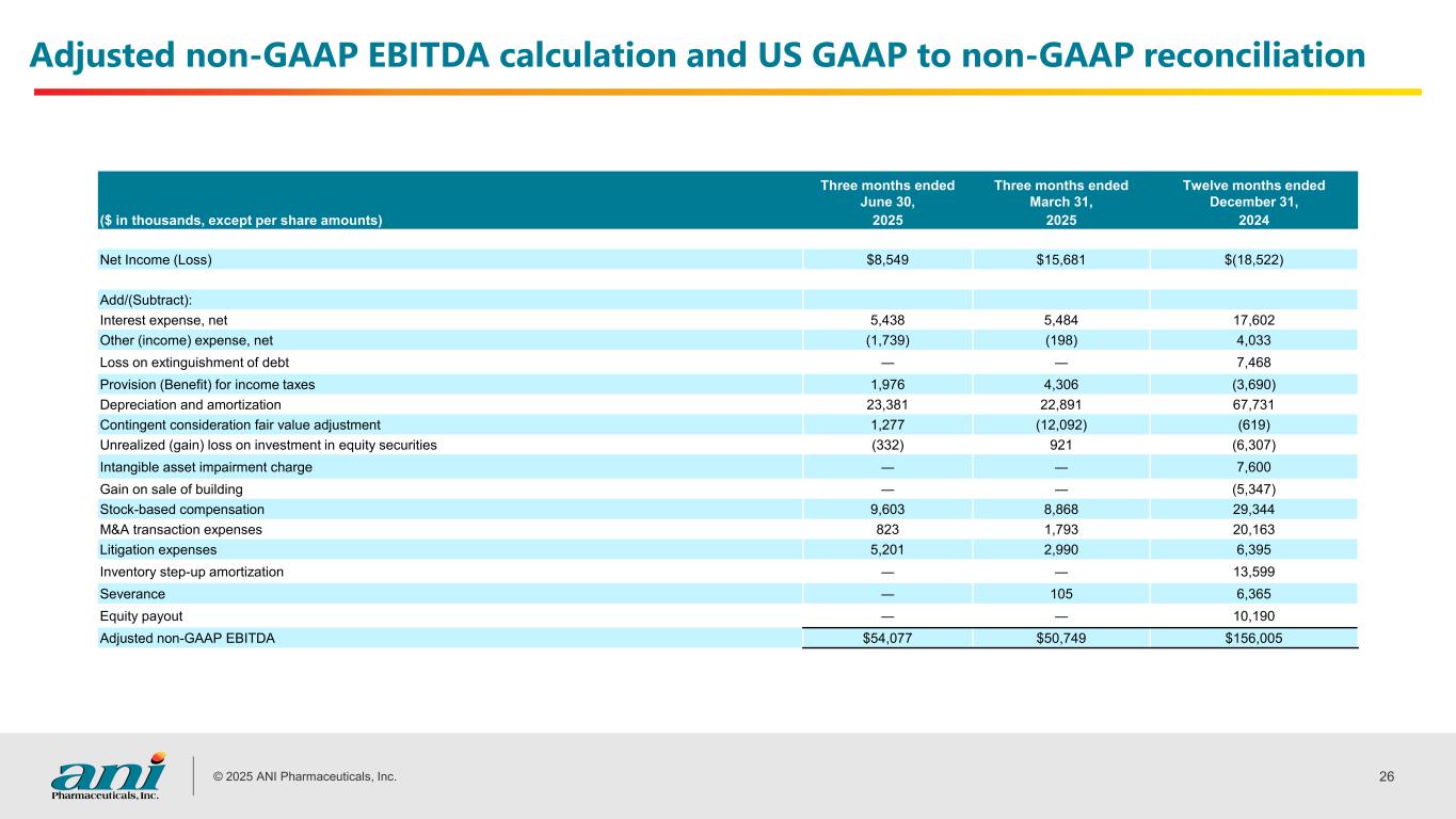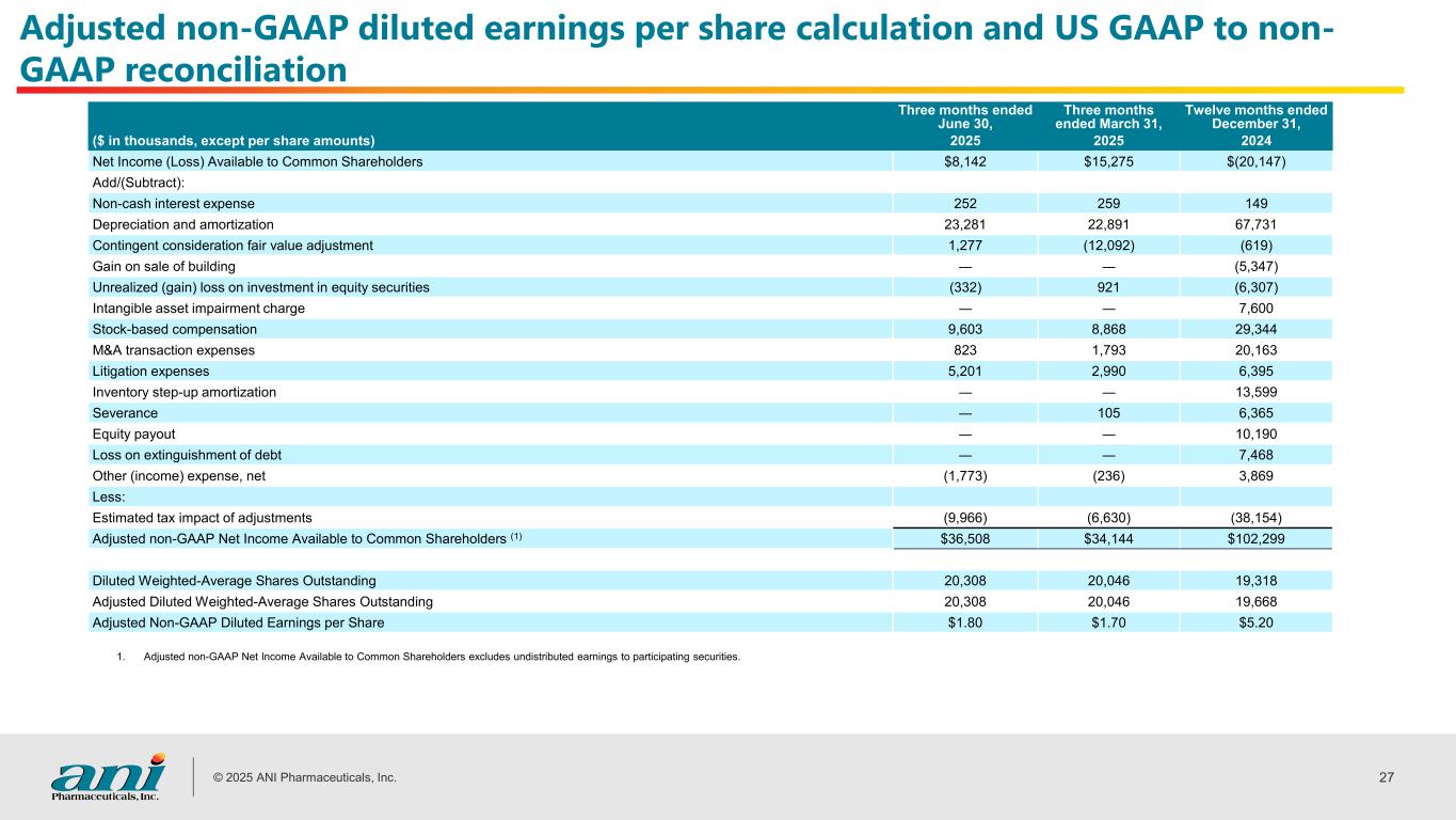 © 2025 ANI Pharmaceuticals, Inc. 26 Adjusted non-GAAP EBITDA calculation and US GAAP to non-GAAP reconciliation Three months ended June 30, Three months ended March 31, Twelve months ended December 31, ($ in thousands, except per share amounts) 2025 2025 2024 Net Income (Loss) $8,549 $15,681 $(18,522) Add/(Subtract): Interest expense, net 5,438 5,484 17,602 Other (income) expense, net (1,739) (198) 4,033 Loss on extinguishment of debt ― ― 7,468 Provision (Benefit) for income taxes 1,976 4,306 (3,690) Depreciation and amortization 23,381 22,891 67,731 Contingent consideration fair value adjustment 1,277 (12,092) (619) Unrealized (gain) loss on investment in equity securities (332) 921 (6,307) Intangible asset impairment charge ― ― 7,600 Gain on sale of building ― ― (5,347) Stock-based compensation 9,603 8,868 29,344 M&A transaction expenses 823 1,793 20,163 Litigation expenses 5,201 2,990 6,395 Inventory step-up amortization ― ― 13,599 Severance ― 105 6,365 Equity payout ― ― 10,190 Adjusted non-GAAP EBITDA $54,077 $50,749 $156,005