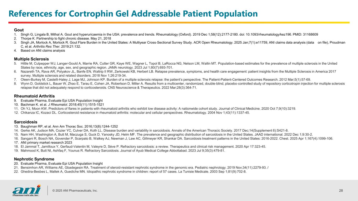© 2025 ANI Pharmaceuticals, Inc. 28 References for Cortrophin Gel Addressable Patient Population Gout 1. Singh G, Lingala B, Mithal A. Gout and hyperuricaemia in the USA: prevalence and trends. Rheumatology (Oxford). 2019 Dec 1;58(12):2177-2180. doi: 10.1093/rheumatology/kez196. PMID: 31168609 2. Thorpe K. Partnership to fight chronic disease. May 21, 2018 3. Singh JA, Morlock A, Morlock R. Gout Flare Burden in the United States: A Multiyear Cross‐Sectional Survey Study. ACR Open Rheumatology. 2025 Jan;7(1):e11759, ANI claims data analysis (data on file), Proudman C, et al. Arthritis Res Ther. 2019;21:132. 4. Based on ANI claims analysis Multiple Sclerosis 5. Hittle M, Culpepper WJ, Langer-Gould A, Marrie RA, Cutter GR, Kaye WE, Wagner L, Topol B, LaRocca NG, Nelson LM, Wallin MT. Population-based estimates for the prevalence of multiple sclerosis in the United States by race, ethnicity, age, sex, and geographic region. JAMA neurology. 2023 Jul 1;80(7):693-701. 6. Nazareth TA, Rava AR, Polyakov JL, Banfe EN, Waltrip II RW, Zerkowski KB, Herbert LB. Relapse prevalence, symptoms, and health care engagement: patient insights from the Multiple Sclerosis in America 2017 survey. Multiple sclerosis and related disorders. 2018 Nov 1;26:219-34. 7. Oleen-Burkey M, Castelli-Haley J, Lage MJ, Johnson KP. Burden of a multiple sclerosis relapse: the patient’s perspective. The Patient-Patient-Centered Outcomes Research. 2012 Mar;5(1):57-69. 8. Wynn D, Goldstick L, Bauer W, Zhao E, Tarau E, Cohen JA, Robertson D, Miller A. Results from a multicenter, randomized, double‐blind, placebo‐controlled study of repository corticotropin injection for multiple sclerosis relapse that did not adequately respond to corticosteroids. CNS Neuroscience & Therapeutics. 2022 Mar;28(3):364-71. Rheumatoid Arthritis 9. Evaluate Pharma, Evaluate Epi USA Population Insight 10. Bachman K. et al. J Rheumatol. 2018;45(11):1515-1521 11. Oh YJ, Moon KW. Predictors of flares in patients with rheumatoid arthritis who exhibit low disease activity: A nationwide cohort study. Journal of Clinical Medicine. 2020 Oct 7;9(10):3219. 12. Chikanza IC, Kozaci DL. Corticosteroid resistance in rheumatoid arthritis: molecular and cellular perspectives. Rheumatology. 2004 Nov 1;43(11):1337-45. Sarcoidosis 13. Baughman RP, et al. Ann Am Thorac Soc. 2016;13(8):1244-1252 14. Gerke AK, Judson MA, Cozier YC, Culver DA, Koth LL. Disease burden and variability in sarcoidosis. Annals of the American Thoracic Society. 2017 Dec;14(Supplement 6):S421-8. 15. Nam HH, Washington A, Butt M, Maczuga S, Guck D, Yanosky JD, Helm MF. The prevalence and geographic distribution of sarcoidosis in the United States. JAAD international. 2022 Dec 1;9:30-2. 16. Sangani R, Bosch NA, Govender P, Scarpato B, Walkey AJ, Newman J, Law AC, Gillmeyer KR, Shankar DA. Sarcoidosis treatment patterns in the United States: 2016-2022. Chest. 2025 Apr 1;167(4):1099-106. 17. ANI primary market research 2023 18. El Jammal T, Jamilloux Y, Gerfaud-Valentin M, Valeyre D, Sève P. Refractory sarcoidosis: a review. Therapeutics and clinical risk management. 2020 Apr 17:323-45. 19. Mahmood K, Butt NI, Ashfaq F, Younus R. Refractory Sarcoidosis. Journal of Ayub Medical College Abbottabad. 2023 Jul 9;35(3):479-81. Nephrotic Syndrome 20. Evaluate Pharma, Evaluate Epi USA Population Insight 21. Bensimhon AR, Williams AE, Gbadegesin RA. Treatment of steroid-resistant nephrotic syndrome in the genomic era. Pediatric nephrology. 2019 Nov;34(11):2279-93. / 22. Ghedira-Besbes L, Mallek A, Guediche MN. Idiopathic nephrotic syndrome in children: report of 57 cases. La Tunisie Medicale. 2003 Sep 1;81(9):702-8.