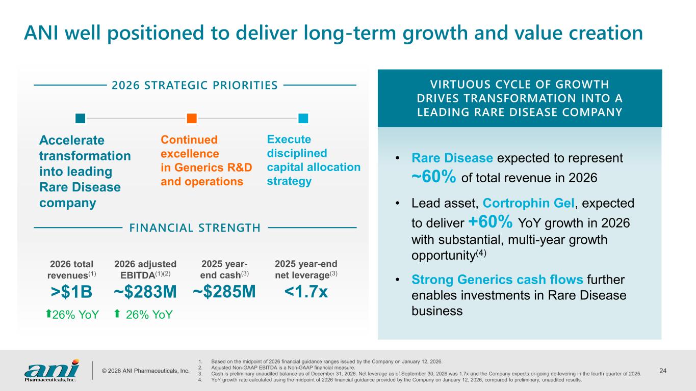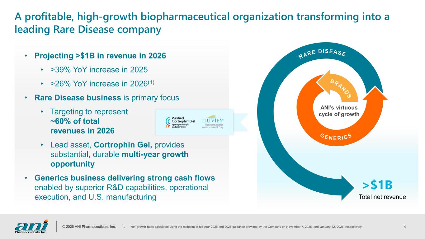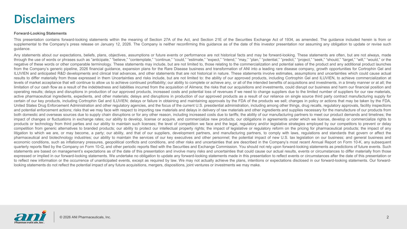 © 2026 ANI Pharmaceuticals, Inc. 2 Disclaimers Forward-Looking Statements This presentation contains forward-looking statements within the meaning of Section 27A of the Act, and Section 21E of the Securities Exchange Act of 1934, as amended. The guidance included herein is from or supplemental to the Company’s press release on January 12, 2026. The Company is neither reconfirming this guidance as of the date of this investor presentation nor assuming any obligation to update or revise such guidance. Any statements about our expectations, beliefs, plans, objectives, assumptions or future events or performance are not historical facts and may be forward-looking. These statements are often, but are not always, made through the use of words or phrases such as “anticipate,” “believe,” “contemplate,” “continue,” “could,” “estimate,” “expect,” “intend,” “may,” “plan,” “potential,” “predict,” “project,” “seek,” “should,” “target,” “will,” “would,” or the negative of these words or other comparable terminology. These statements may include, but are not limited to, those relating to the commercialization and potential sales of the product and any additional product launches from the Company’s generic pipeline, 2026 financial guidance, expansion plans for the Rare Disease business and transformation of ANI into a leading rare disease company, growth opportunities for Cortrophin Gel and ILUVIEN and anticipated R&D developments and clinical trial advances, and other statements that are not historical in nature. These statements involve estimates, assumptions and uncertainties which could cause actual results to differ materially from those expressed in them Uncertainties and risks include, but are not limited to: the ability of our approved products, including Cortrophin Gel and ILUVIEN, to achieve commercialization at levels of market acceptance that will continue to allow us to achieve continued profitability; our ability to complete or achieve any, or all of the intended benefits of acquisitions and investments, in a timely manner or at all; the limitation of our cash flow as a result of the indebtedness and liabilities incurred from the acquisition of Alimera; the risks that our acquisitions and investments, could disrupt our business and harm our financial position and operating results; delays and disruptions in production of our approved products, increased costs and potential loss of revenues if we need to change suppliers due to the limited number of suppliers for our raw materials, active pharmaceutical ingredients, expedients, and other materials; delays and disruptions in production of our approved products as a result of our reliance on single source third party contract manufacturing supply for certain of our key products, including Cortrophin Gel and ILUVIEN; delays or failure in obtaining and maintaining approvals by the FDA of the products we sell; changes in policy or actions that may be taken by the FDA, United States Drug Enforcement Administration and other regulatory agencies, and the focus of the current U.S. presidential administration, including among other things, drug recalls, regulatory approvals, facility inspections and potential enforcement actions; risks that we may face with respect to importing raw materials and delays in delivery of raw materials and other ingredients and supplies necessary for the manufacture of our products from both domestic and overseas sources due to supply chain disruptions or for any other reason, including increased costs due to tariffs; the ability of our manufacturing partners to meet our product demands and timelines; the impact of changes or fluctuations in exchange rates; our ability to develop, license or acquire, and commercialize new products; our obligations in agreements under which we license, develop or commercialize rights to products or technology from third parties and our ability to maintain such licenses; the level of competition we face and the legal, regulatory and/or legislative strategies employed by our competitors to prevent or delay competition from generic alternatives to branded products; our ability to protect our intellectual property rights; the impact of legislative or regulatory reform on the pricing for pharmaceutical products; the impact of any litigation to which we are, or may become, a party; our ability, and that of our suppliers, development partners, and manufacturing partners, to comply with laws, regulations and standards that govern or affect the pharmaceutical and biotechnology industries; our ability to maintain the services of our key executives and other personnel; the potential impact of new U.S. tax legislation on our business; and general business and economic conditions, such as inflationary pressures, geopolitical conflicts and conditions, and other risks and uncertainties that are described in the Company’s most recent Annual Report on Form 10-K, any subsequent quarterly reports filed by the Company on Form 10-Q, and other periodic reports filed with the Securities and Exchange Commission. You should not rely upon forward-looking statements as predictions of future events. Such statements are based on management’s expectations as of the date of this presentation and involve many risks and uncertainties that could cause our actual results, events or circumstances to differ materially from those expressed or implied in our forward-looking statements. We undertake no obligation to update any forward-looking statements made in this presentation to reflect events or circumstances after the date of this presentation or to reflect new information or the occurrence of unanticipated events, except as required by law. We may not actually achieve the plans, intentions or expectations disclosed in our forward-looking statements. Our forward- looking statements do not reflect the potential impact of any future acquisitions,