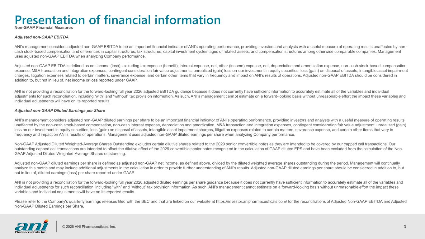© 2026 ANI Pharmaceuticals, Inc. 3 Presentation of financial information Non-GAAP Financial Measures Adjusted non-GAAP EBITDA ANI’s management considers adjusted non-GAAP EBITDA to be an important financial indicator of ANI’s operating performance, providing investors and analysts with a useful measure of operating results unaffected by non- cash stock-based compensation and differences in capital structures, tax structures, capital investment cycles, ages of related assets, and compensation structures among otherwise comparable companies. Management uses adjusted non-GAAP EBITDA when analyzing Company performance. Adjusted non-GAAP EBITDA is defined as net income (loss), excluding tax expense (benefit), interest expense, net, other (income) expense, net, depreciation and amortization expense, non-cash stock-based compensation expense, M&A transaction and integration expenses, contingent consideration fair value adjustments, unrealized (gain) loss on our investment in equity securities, loss (gain) on disposal of assets, intangible asset impairment charges, litigation expenses related to certain matters, severance expense, and certain other items that vary in frequency and impact on ANI’s results of operations. Adjusted non-GAAP EBITDA should be considered in addition to, but not in lieu of, net income or loss reported under GAAP. ANI is not providing a reconciliation for the forward-looking full year 2026 adjusted EBITDA guidance because it does not currently have sufficient information to accurately estimate all of the variables and individual adjustments for such reconciliation, including “with” and “without” tax provision information. As such, ANI’s management cannot estimate on a forward-looking basis without unreasonable effort the impact these variables and individual adjustments will have on its reported results. Adjusted non-GAAP Diluted Earnings per Share ANI’s management considers adjusted non-GAAP diluted earnings per share to be an important financial indicator of ANI’s operating performance, providing investors and analysts with a useful measure of operating results unaffected by the non-cash stock-based compensation, non-cash interest expense, depreciation and amortization, M&A transaction and integration expenses, contingent consideration fair value adjustment, unrealized (gain) loss on our investment in equity securities, loss (gain) on disposal of assets, intangible asset impairment charges, litigation expenses related to certain matters, severance expense, and certain other items that vary in frequency and impact on ANI’s results of operations. Management uses adjusted non-GAAP diluted earnings per share when analyzing Company performance. Non-GAAP Adjusted Diluted Weighted-Average Shares Outstanding excludes certain dilutive shares related to the 2029 senior convertible notes as they are intended to be covered by our capped call transactions. Our outstanding capped call transactions are intended to offset the dilutive effect of the 2029 convertible senior notes recognized in the calculation of GAAP diluted EPS and have been excluded from the calculation of the Non- GAAP Adjusted Diluted Weighted-Average Shares outstanding. Adjusted non-GAAP diluted earnings per share is defined as adjusted non-GAAP net income, as defined above, divided by the diluted weighted average shares outstanding during the period. Management will continually analyze this metric and may include additional adjustments in the calculation in order to provide further understanding of ANI’s results. Adjusted non-GAAP diluted earnings per share should be considered in addition to, but not in lieu of, diluted earnings (loss) per share reported under GAAP. ANI is not providing a reconciliation for the forward-looking full year 2026 adjusted diluted earnings per share guidance because it does not currently have sufficient information to accurately estimate all of the variables and individual adjustments for such reconciliation, including “with” and “without” tax provision information. As such, ANI’s management cannot estimate on a forward-looking basis without unreasonable effort the impact these variables and individual adjustments will have on its reported results. Please refer to the Company's quarterly earnings releases filed with the SEC and that are linked on our website at https://investor.anipharmaceuticals.com/ for the reconciliations of Adjusted Non-GAAP EBITDA and Adjusted Non-GAAP Diluted Earnings per Share.