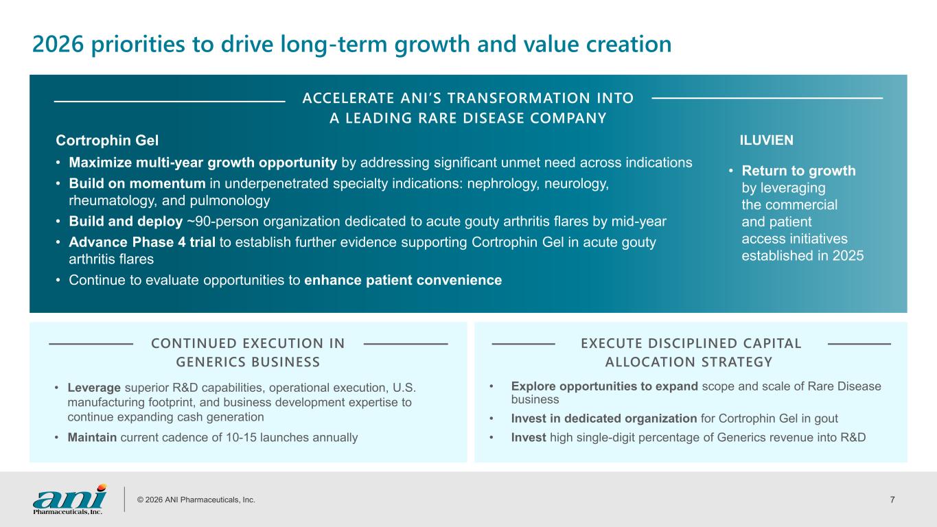 © 2026 ANI Pharmaceuticals, Inc. 6 2025 accomplishments drove robust expansion across the business Metric(1) ($ millions, except EPS) 2025 YoY Growth(4) Net Revenue (Total Company) $854 - $873 >39% Cortrophin Gel Net Revenue $348 76% ILUVIEN Net Revenue $75 N/M Adjusted Non-GAAP EBITDA(2) $221 - $228 >42% Adjusted Non-GAAP Diluted EPS(2)(3) $7.37 - $7.64 >42% Rare Disease generated 84% YoY topline growth Generics outperformed with >20% YoY topline growth • Outperformance driven by superior R&D capabilities, operational execution, and U.S. based manufacturing footprint • Delivered strong cadence of new product launches, including first-to-market launch of prucalopride and partnered generic launch 1. Represents 2025 financial guidance provided by the Company on November 7, 2025, except for Cortrophin Gel and ILUVIEN net revenue which represent preliminary, unaudited results provided by the Company on January 12, 2026. 2. Adjusted non-GAAP EBITDA and Adjusted Diluted non-GAAP EPS are non-GAAP financial measures. 3. Non-GAAP Adjusted Diluted Weighted-Average Shares Outstanding exclude certain dilutive shares related to the 2029 senior convertible notes as they are intended to be covered by our capped call transactions. 4. Year-over-year growth is based on the low end of 2025 guidance ranges except for Cortrophin Gel net revenue for which the comparison is to preliminary, unaudited 2025 results. • Lead Rare Disease asset Cortrophin Gel delivered exceptional YoY growth of 76% • Accelerated momentum across neurology, rheumatology, nephrology, and pulmonology through sales force expansion • Acute gouty arthritis flares grown to over 15% of Cortrophin use • Realized synergies from combined ophthalmology salesforce • Established ILUVIEN commercial and access initiatives to support growth in 2026