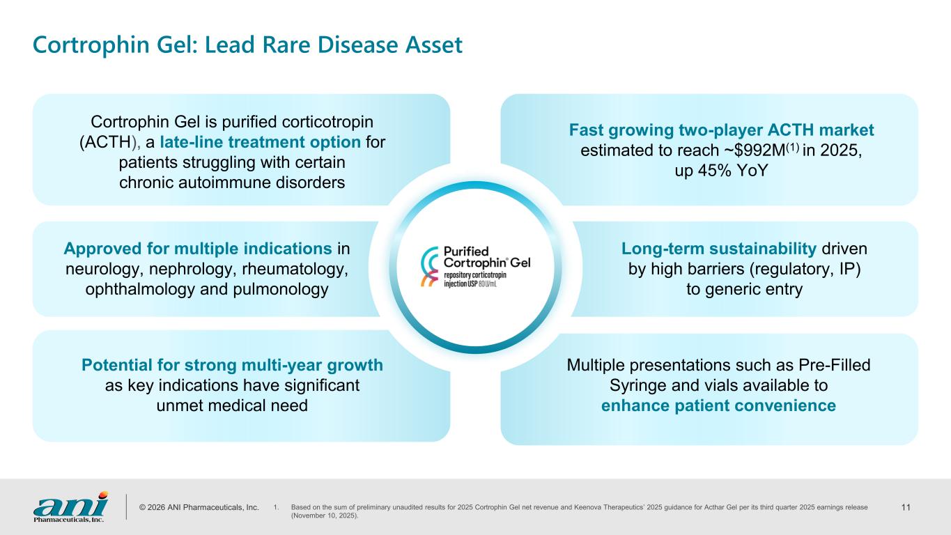 Mr. Lalwani added, “To accelerate our transformation into a leading Rare Disease company, we are focused on maximizing the substantial, multi-year growth opportunity for Cortrophin Gel by addressing the significant unmet medical need across indications. In 2026, we will continue momentum in our current priority therapeutic areas and also plan to expand our Rare Disease organization by mid-year, enabling us to capture the opportunity in acute gouty arthritis flares, an indication unique to ANI. Importantly, the ongoing execution across our Generics and Brands business will provide healthy cash generation to support our Rare Disease business. We look forward to driving long-term growth in 2026 and beyond to fulfill our purpose of Serving Patients, Improving Lives, while also creating durable value across the company.”