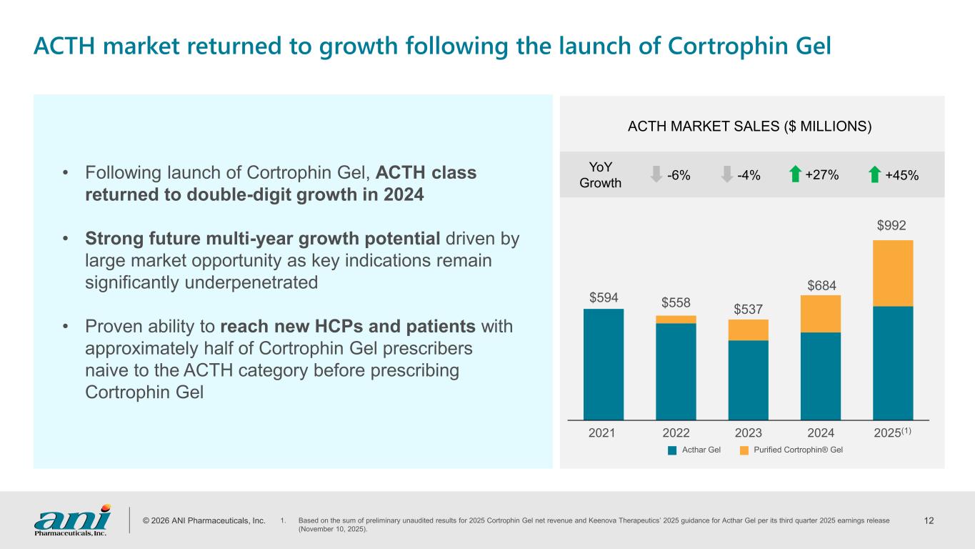 © 2026 ANI Pharmaceuticals, Inc. 11 Cortrophin Gel: Lead Rare Disease Asset Cortrophin Gel is purified corticotropin (ACTH), a late-line treatment option for patients struggling with certain chronic autoimmune disorders Approved for multiple indications in neurology, nephrology, rheumatology, ophthalmology and pulmonology Potential for strong multi-year growth as key indications have significant unmet medical need Multiple presentations such as Pre-Filled Syringe and vials available to enhance patient convenience Long-term sustainability driven by high barriers (regulatory, IP) to generic entry Fast growing two-player ACTH market estimated to reach ~$992M(1) in 2025, up 45% YoY 1. Based on the sum of preliminary unaudited results for 2025 Cortrophin Gel net revenue and Keenova Therapeutics’ 2025 guidance for Acthar Gel per its third quarter 2025 earnings release (November 10, 2025).