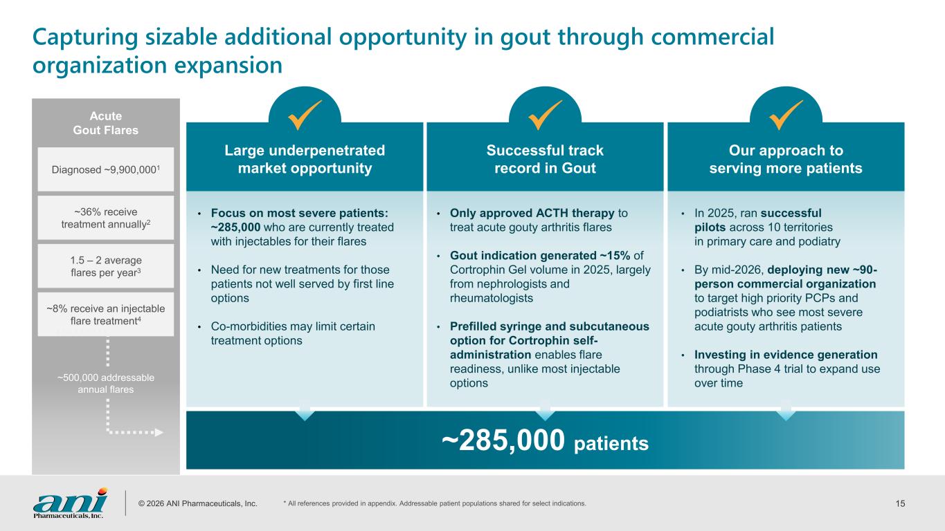 © 2026 ANI Pharmaceuticals, Inc. 14 $42 $112 $198 $348 $540 - $575 2022 2023 2024 2025 2026E Cortrophin Gel Net Revenues ($ millions) Cortrophin to deliver significant growth in fifth year of launch with multi-year growth opportunity ahead 1. Year-over-year growth calculated based on the midpoint of 2026 financial guidance rage issued by the Company on January 12, 2026. 2. Represents preliminary, unaudited results issued by the Company on January 12, 2026. 3. Represents 2026 financial guidance issued by the Company on January 12, 2026. (2) (3) Investing in High ROI commercial initiatives • Focus efforts to continue momentum established in Nephrology, Neurology, Rheumatology and Pulmonology as the ACTH market expands • Building a new ~90-person organization dedicated to gout that targets primary care and podiatrist offices, expected to deploy mid-2026 • Realizing synergies with integrated ophthalmology team Generation of scientific and clinical evidence • Advancing Phase 4 clinical trial of Cortrophin Gel in acute gouty arthritis flares • Robust pipeline of investigator-initiated trials across disease states • Continued investment in preclinical data and publications Enhancing convenience • Launched Pre-Filled Syringe in 2025 • Continuing to evaluate opportunities to enhance patient convenience +76% +60%(1)