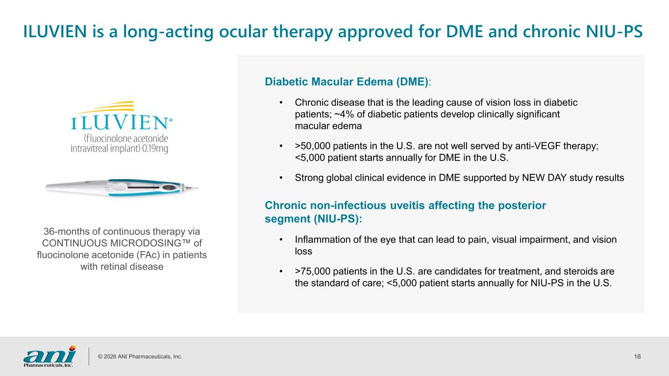 © 2026 ANI Pharmaceuticals, Inc. 17 Returning ILUVIEN to growth by leveraging established commercial and patient access initiatives New strategic investments in marketing and medical affairs to support increased awareness of NEW DAY clinical data Growing use of alternative access channels to navigate market access challenges for Medicare patients Strengthened commercial team and further enhanced promotional efforts Established coverage for both DME and NIU-PS indications enabling HCPs to use one product across two indications and streamline care