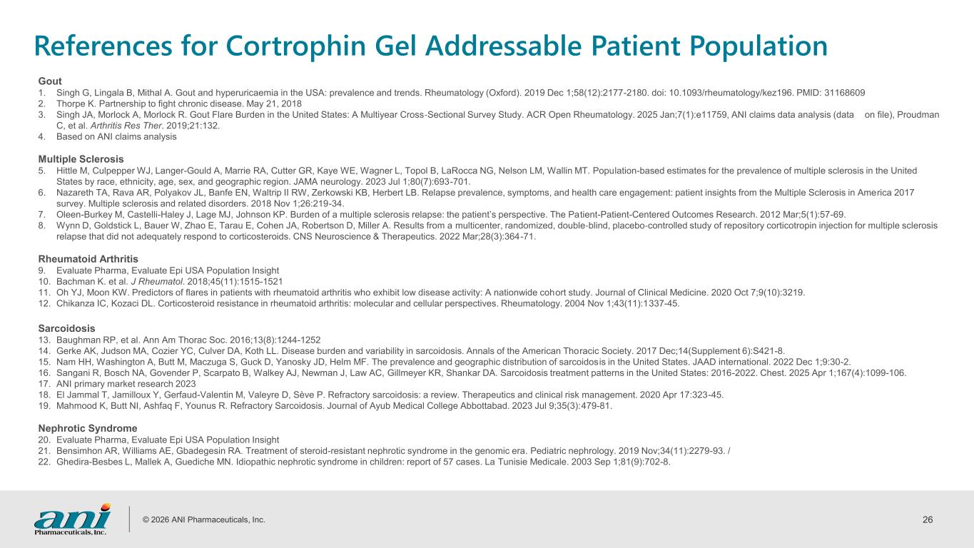 © 2026 ANI Pharmaceuticals, Inc. 26 References for Cortrophin Gel Addressable Patient Population Gout 1. Singh G, Lingala B, Mithal A. Gout and hyperuricaemia in the USA: prevalence and trends. Rheumatology (Oxford). 2019 Dec 1;58(12):2177-2180. doi: 10.1093/rheumatology/kez196. PMID: 31168609 2. Thorpe K. Partnership to fight chronic disease. May 21, 2018 3. Singh JA, Morlock A, Morlock R. Gout Flare Burden in the United States: A Multiyear Cross‐Sectional Survey Study. ACR Open Rheumatology. 2025 Jan;7(1):e11759, ANI claims data analysis (data on file), Proudman C, et al. Arthritis Res Ther. 2019;21:132. 4. Based on ANI claims analysis Multiple Sclerosis 5. Hittle M, Culpepper WJ, Langer-Gould A, Marrie RA, Cutter GR, Kaye WE, Wagner L, Topol B, LaRocca NG, Nelson LM, Wallin MT. Population-based estimates for the prevalence of multiple sclerosis in the United States by race, ethnicity, age, sex, and geographic region. JAMA neurology. 2023 Jul 1;80(7):693-701. 6. Nazareth TA, Rava AR, Polyakov JL, Banfe EN, Waltrip II RW, Zerkowski KB, Herbert LB. Relapse prevalence, symptoms, and health care engagement: patient insights from the Multiple Sclerosis in America 2017 survey. Multiple sclerosis and related disorders. 2018 Nov 1;26:219-34. 7. Oleen-Burkey M, Castelli-Haley J, Lage MJ, Johnson KP. Burden of a multiple sclerosis relapse: the patient’s perspective. The Patient-Patient-Centered Outcomes Research. 2012 Mar;5(1):57-69. 8. Wynn D, Goldstick L, Bauer W, Zhao E, Tarau E, Cohen JA, Robertson D, Miller A. Results from a multicenter, randomized, double‐blind, placebo‐controlled study of repository corticotropin injection for multiple sclerosis relapse that did not adequately respond to corticosteroids. CNS Neuroscience & Therapeutics. 2022 Mar;28(3):364-71. Rheumatoid Arthritis 9. Evaluate Pharma, Evaluate Epi USA Population Insight 10. Bachman K. et al. J Rheumatol. 2018;45(11):1515-1521 11. Oh YJ, Moon KW. Predictors of flares in patients with rheumatoid arthritis who exhibit low disease activity: A nationwide cohort study. Journal of Clinical Medicine. 2020 Oct 7;9(10):3219. 12. Chikanza IC, Kozaci DL. Corticosteroid resistance in rheumatoid arthritis: molecular and cellular perspectives. Rheumatology. 2004 Nov 1;43(11):1337-45. Sarcoidosis 13. Baughman RP, et al. Ann Am Thorac Soc. 2016;13(8):1244-1252 14. Gerke AK, Judson MA, Cozier YC, Culver DA, Koth LL. Disease burden and variability in sarcoidosis. Annals of the American Thoracic Society. 2017 Dec;14(Supplement 6):S421-8. 15. Nam HH, Washington A, Butt M, Maczuga S, Guck D, Yanosky JD, Helm MF. The prevalence and geographic distribution of sarcoidosis in the United States. JAAD international. 2022 Dec 1;9:30-2. 16. Sangani R, Bosch NA, Govender P, Scarpato B, Walkey AJ, Newman J, Law AC, Gillmeyer KR, Shankar DA. Sarcoidosis treatment patterns in the United States: 2016-2022. Chest. 2025 Apr 1;167(4):1099-106. 17. ANI primary market research 2023 18. El Jammal T, Jamilloux Y, Gerfaud-Valentin M, Valeyre D, Sève P. Refractory sarcoidosis: a review. Therapeutics and clinical risk management. 2020 Apr 17:323-45. 19. Mahmood K, Butt NI, Ashfaq F, Younus R. Refractory Sarcoidosis. Journal of Ayub Medical College Abbottabad. 2023 Jul 9;35(3):479-81. Nephrotic Syndrome 20. Evaluate Pharma, Evaluate Epi USA Population Insight 21. Bensimhon AR, Williams AE, Gbadegesin RA. Treatment of steroid-resistant nephrotic syndrome in the genomic era. Pediatric nephrology. 2019 Nov;34(11):2279-93. / 22. Ghedira-Besbes L, Mallek A, Guediche MN. Idiopathic nephrotic syndrome in children: report of 57 cases. La Tunisie Medicale. 2003 Sep 1;81(9):702-8.